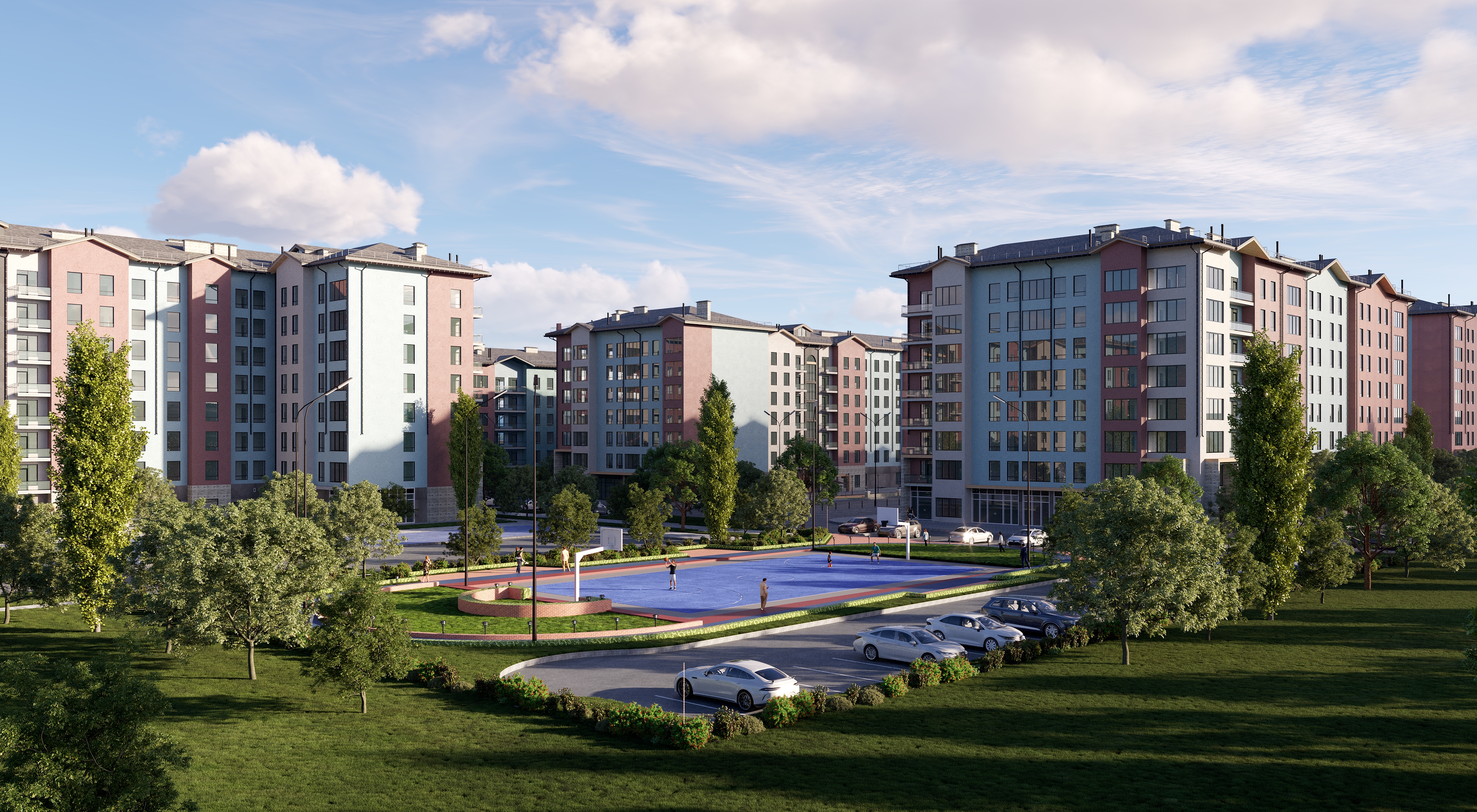 Пространство, где всё продумано для ежедневного комфорта. На территории комплекса качественное озеленение, спортивные и детские площадки, беговые дорожки, тренажёры, зоны отдыха и беседки с Wi‑Fi. На первых этажах — кафе, аптеки, магазины. Дополнительно: кладовые помещения, просторный паркинг, собственный детский сад.